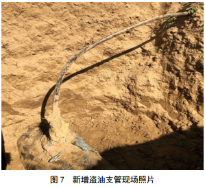 在一段修復過(guò)盜油支管的管道上又發(fā)現兩處新增支管,累計支管數量達到12個(gè)(圖 8),現場(chǎng)開(kāi)挖時(shí)發(fā)現部分已出現滲油現象(圖 9),目前該段管道已做換管處理。