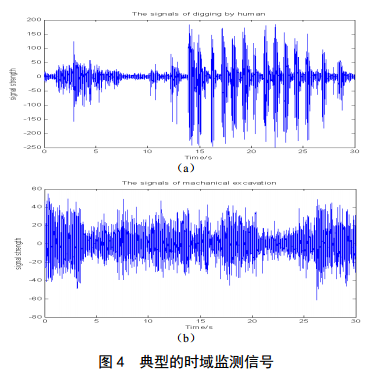 圖4(a)為典型的人工挖掘時(shí)域監測信號曲線(xiàn),圖4(b)為典型的挖掘機在管道附近真實(shí)挖掘行為的時(shí)域監測信號曲線(xiàn)。其中,人工挖掘位置相對于監測主機近,機械挖掘相對于監測主機遠,因此人 工挖掘的整體信號強度比機械挖掘強,且相對于機械挖掘信號更清晰,主要是機械挖掘受發(fā)動(dòng)機震動(dòng)的影響,導致信號整體能量較強,而人工挖掘信號局部較強。
