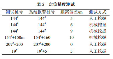 表2為測試點(diǎn)的定位精度測試結果,實(shí)驗結果顯示在測試樁號處進(jìn)行人工挖掘激勵和機械挖掘激勵下均能準確報警,報警樁號與測試樁號的距離偏差具有隨機性,但總體距離偏差不超過(guò)10 m,與本測試系統的定位精度(10 m)比較吻合。