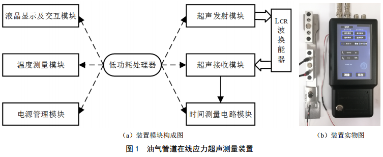 自主研發(fā)了“油氣管道在線(xiàn)應力超聲測量裝置”(專(zhuān)利號ZL 201710110210X),裝置主要包括低功耗處理器、超聲發(fā)射模塊、超聲接收模塊、時(shí)間測量電路模塊、液晶顯示及交互模塊、電源管理模塊和溫度測量模塊(圖 1)。研發(fā)和改進(jìn)的整個(gè)周期都考慮了油氣管道應力測試的多種工況,更能適應油氣管道現場(chǎng)測試的復雜環(huán)境。該油氣管道專(zhuān)業(yè)性應力測試工具成功將超聲波傳播時(shí)間測量精度由 1ns精確至0.1 ns,管道在線(xiàn)應力測量誤差小于20 MPa。