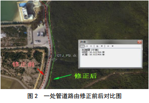 通過(guò)集成應用工程測量、智能檢測、航空攝影測量、地下管線(xiàn)探測、數據比對、坐標修正與轉換六項技術(shù),解決了在役管道難以獲取必要的基礎性數據問(wèn)題,獨創(chuàng )3S技術(shù)集成應用。運用該技術(shù)對某管道全線(xiàn)開(kāi)挖驗證105個(gè)點(diǎn),數據偏差全部在±0.86米以?xún),其中在?.5米之內的占92%(圖 1),實(shí)現管道大量基礎數據校準與更新,例如圖 2為一處管道路由修正前后對比圖,最終使管道中線(xiàn)坐標偏差控制在±1米以?xún)取?o:p>