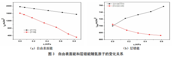 相變的發(fā)生主要依賴(lài)于溫度和內應力的變化,氫原子對其影響不大。斷裂的發(fā)生主要依賴(lài)于自由表面能,位錯發(fā)射主要依賴(lài)于層錯能,因此自由表面能和層錯能受到關(guān)注和研究(圖 3)。