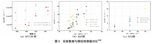 ,高強度的鋼,由于塑性區小,塑性變形產(chǎn)生的缺陷對氫原子的囚禁作用不明顯,氫擴散相關(guān)的裂紋擴展速率更多的依賴(lài)于HEDE機制,因此強度越高的鋼, n 的數值越接近于 1 。 此 觀(guān) 點(diǎn) , 可 在 圖 5 中 被 印 證 , H Y 1 3 0 鋼(σys=932 MPa)不同溫度下的裂紋生長(cháng)速率值,在 n 值為0.98時(shí)和預測值(空心點(diǎn))較為吻合,而X65(σys=448 MPa)鋼材在n值為0.95時(shí)數據擬合較好,X52鋼材(σys=382 MPa) n值為0.88時(shí)數據都擬合較好。因此總裂紋擴展速率可以公式(7)表示。