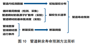 圖 10簡(jiǎn)要概述了管道壽命預測的步驟,首先通過(guò)內檢測,獲取管道初始裂紋狀態(tài);通過(guò)站場(chǎng)傳感器收集管道內的應力變化情況;通過(guò)實(shí)驗和模擬得到氫原子擴散和濃度的基本參數;通過(guò)斷裂實(shí)驗測得管道失效的閾值;結合軟件計算出的裂紋生長(cháng)速度和裂紋長(cháng)度變化,計算管道剩余壽命,每次內檢測結束后,及時(shí)收集數據,與模型之前的預測結果進(jìn)行比較,反復驗證,通過(guò)機器學(xué)習的方法,可以使預測準確性不斷提高。