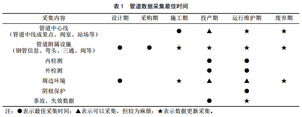 (2)數據采集過(guò)程管理是決定數據采集質(zhì)量的決定性因素。第一階段,數據承包商應綜合考慮智能化管理系統要求和現場(chǎng)實(shí)際情況編制數據采集方案,方案經(jīng)數據采集主管部門(mén)、安全管理部門(mén)、智能化系統管理部門(mén)審核通過(guò)后才能開(kāi)展數據采集。第二階段,工程建設期間,管道建設項目部在數據采集工作中發(fā)揮主導作用。項目部在數據采集期間應抓住各類(lèi)數據采集的時(shí)間節點(diǎn)(表 1),督促和監督數據采集承包商的采集進(jìn)度和質(zhì)量,重點(diǎn)關(guān)注不可復測的數據采集,避免因漏采而反復開(kāi)挖,增加采集成本和工作 量。如焊縫、磁標記等回填后需要重新定位開(kāi)挖的坐標數據采集。第三階段,項目部應結合“三查四定”定期或不定期赴現場(chǎng)施測和抽樣核對各類(lèi)數據,以驗證和審核數據的準確性,此外還要定期抽樣復查。內業(yè)可將采集的數據導入ArcMap、 91衛圖等軟件逐點(diǎn)核實(shí)焊縫間距、鋼管長(cháng)度、管道軌跡等基礎數據的準確性。對于數據采集存在問(wèn)題的情況要加倍抽查,并形成數據采集情況月度通報,對數據采集工作進(jìn)行總結,對不符合項須及時(shí)下達整改通知。第四階段,數據校驗;谥悄芑芾硐到y中的基礎校驗、存在校驗、邏輯校驗和GIS校驗規則,識別鋼管焊口數據的準確性、附屬物數據的完整度、數據關(guān)聯(lián)度。通過(guò)以上手段完成入庫數據的真實(shí)性、及時(shí)性、準確性和完整性的審核,從而建立管道建設期數據向管道運行期高質(zhì)量移交的數字化通道。