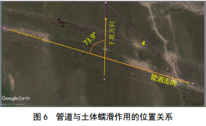 管道橫向敷設于斜坡中上部,坡體角度17°,坡腳有河道,坡體為粘土含少量卵石。此處海拔3 744 m,地面1.5 m以下就有凍土層分布,每年9月底土層上凍,到次年的5月左右才開(kāi)化。由于開(kāi)挖管溝和敷設管道,周邊巖土層受管道溫度影響較大,季節性?xún)鐾翆娱_(kāi)始融化,坡面融水漫流。融水入滲致使周邊土體呈塑流狀,破壞了土體原有的平衡狀態(tài),垂直于管道敷設方向出現蠕滑。目前,斜坡體已出現明顯滑動(dòng)跡象,斜坡前緣呈圓弧狀外凸;原本呈直線(xiàn)狀布設的管溝出現弧狀彎曲,凸向坡外;坡體內設置的電線(xiàn)桿已向滑動(dòng)方向傾斜。從現場(chǎng)調查來(lái)看,滑坡長(cháng)約120 m,管溝內側坡體已向管道外側推移2.5 m,推測滑動(dòng)面為永凍土與融化土層的分界面,嚴重影響管道安全。結合現場(chǎng)踏勘、竣工資料和衛星圖影像判斷,管道與土體蠕滑作用的位置關(guān)系如圖 6所示,管道與坡體方向的夾角為73.9°。
