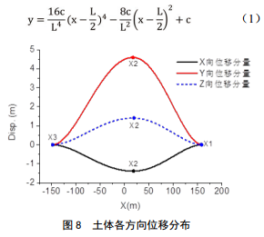 按照前述坐標體系,將管道的空間位移矢量分解為y方向和z方向,分別進(jìn)行位移分布擬合,擬合中采用了如式(1)所示的四次位移分布假設,得到管道承受的各方向土體位移分布如圖 8所示。
