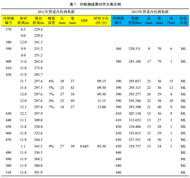 在環(huán)焊縫對齊成果的基礎上,根據相對距離和時(shí)鐘位置對兩次內檢測報告的腐蝕缺陷進(jìn)行對齊和匹配。先采用軟件將缺陷位置信息初步進(jìn)行缺陷匹配,再人工進(jìn)一步分析對齊,必要時(shí)查看內檢測原始信號進(jìn)行分析,得到內檢測成果對齊大表,如表 1所示。