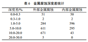 匹配缺陷是指在同一位置,兩次內檢測都報告了缺陷,但存在內、外區分和深度量化差別。如缺陷深度尺寸,不僅出現深度增加,還可能出現深度“減小”。而缺陷不會(huì )真的變淺,主要是由誤差導致的。內檢測報告的深度量化精度通常由一定置信度下的容差給出, SY/T 6597―2018《油氣管道內檢測技術(shù)規范》規定,對于均勻金屬損失和點(diǎn)蝕, 90%置信度下的容差為10% wt。在這一范圍內的缺陷深度,都符合標準規定(表 2)。