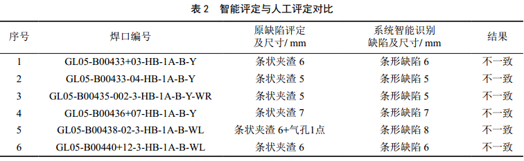 將環(huán)焊縫焊接缺陷智能評定系統實(shí)際應用于坪山—前灣天然氣管線(xiàn),發(fā)現與人工評定不一致處,主要為將條狀夾渣評為條狀缺陷(表 2)。