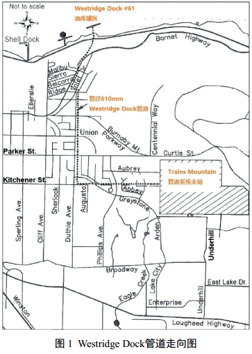 加拿大Kinder Morgan公司(KMC,金德?tīng)枿D摩根公司)運營(yíng)管理的Westridge Dock原油輸送管道聯(lián)絡(luò )線(xiàn)建于1953年,管徑610 mm,壁厚6.4 mm,最大運行壓力(MOP) 3.36 MPa,長(cháng)度4.13 km,起點(diǎn)位于Trans Mountain管道系統末站,終點(diǎn)位于WestridgeDock儲油庫(圖 1 )。 2007年7月24日,被第三方施工開(kāi)挖損壞,約234 m3原油發(fā)生泄漏。泄漏原油噴射到空中高達12~15 m,持續約25分鐘。 50戶(hù)家庭、附近公路和臨近土地受到事故影響,公路因事故封閉了數天。原油流進(jìn)下水道系統,最終進(jìn)入Burnaby海域,并在風(fēng)和潮水作用下進(jìn)一步向海灣擴散。約1200 m海岸線(xiàn)受溢出原油影響,大量海岸生物受到污染。