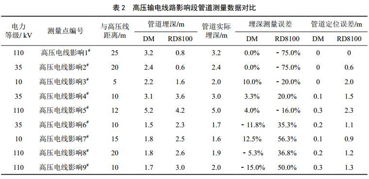 在高壓線(xiàn)影響管段采集9個(gè)點(diǎn)位的數據用于比對 分 析 ( 表 2 ) , D M 在 測 量 管 道 埋 深 時(shí) 整體誤差為﹣15%~12.5%。其中有8個(gè)點(diǎn)位(占樣本量的89%)的測量誤差為﹣11.8%~12.5%,測量誤差絕對值的平均值為5.9%;另外1個(gè)點(diǎn)位(占樣本量的11%)受高壓線(xiàn)影響相對 突 出 , 深 度 測 量 誤 差 絕對 值 達 到 1 5 % 。 R D 8 1 0 0 在 測 量 管 道 埋 深 時(shí) 整 體誤差為﹣75%~56%,其中4個(gè)點(diǎn)位(占樣本量的44.4%)測量誤差絕對值超過(guò)了50%, 6個(gè)點(diǎn)位(占樣本量的66.7%)測量誤差絕對值超過(guò)了35.3%,全部樣本的測量誤差絕對值的平均值為42.7%,整體誤差較大。由此可見(jiàn), RD 8100在高壓線(xiàn)附近受影響較大,測量管道位置和埋深數據都會(huì )出較大的偏差;DM在高壓線(xiàn)附近受影響較小,測量管道位置和埋深數據偏差都較小,而且在有高壓線(xiàn)干擾的時(shí)候, DM的測量數據更加穩定,不會(huì )出現RD 8100測量時(shí)出現的數據大范圍跳動(dòng)的情況。