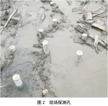 對所需探測深埋管道進(jìn)行現場(chǎng)踏勘,使用電磁感 應法(DM 管道檢測儀)初步探明深埋管道大致位置及深度。在距離深埋管道中心一側3 m到1 m處選取多個(gè)點(diǎn)位,由遠及近進(jìn)行探測孔鉆孔施工,設計孔深取電磁感應法初步測量深度的2倍(圖 2)。