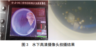首先結合管道埋深及位置,在被測管道正上方鉆孔,直至驗證孔與深埋管道觸碰。其次,利用高壓水管對驗證孔沖水清洗,沖洗和置換孔內殘留泥漿,確?變人|(zhì)清晰。最后用水下高清攝像頭對目標深埋管道進(jìn)行可視化驗證(圖 3),實(shí)現“見(jiàn)管”,進(jìn)一步確定管道位置。