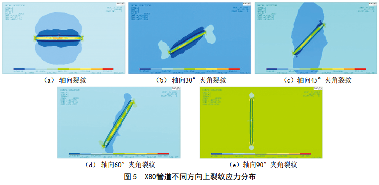 通過(guò)ANSYS建立含不同方向裂紋的X80管道應力場(chǎng)模型,管道長(cháng)5 000 mm,裂紋深3 mm、長(cháng)3 mm、寬1 mm,管道內壓3 MPa。當裂紋方向不同時(shí),即裂紋與管道軸向方向夾角不斷增大時(shí), X80管道裂紋應力分布如圖 5所示。提取各仿真過(guò)程中的裂紋尖端應力值見(jiàn)表 2。