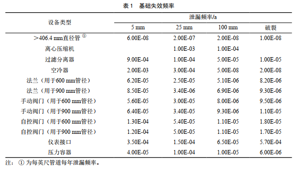 本文選取SY/T 6714― 2008中表31推薦的基礎失效頻率,并結合《OGP Risk Assessment DataDirectory-Process Release Frequencies》中推薦的部分泄漏頻率,作為本次定量風(fēng)險分析的基礎失效頻率,如表 1所示。