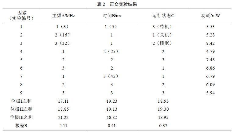 3號實(shí)驗結果的功耗為8.42 mW ,結果最優(yōu),所以較好的方案為A3B1C2。