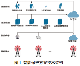 依托管道周邊的鐵塔基建資源,采用現代化監控傳感器,利用人工智能技術(shù)對管道周邊出現的各種車(chē)輛、行人等和偷盜原油、建筑施工場(chǎng)景的相關(guān)因素進(jìn)行解析,同時(shí)接入大數據算法對人工智能解析之后數據進(jìn)行實(shí)時(shí)分析,對危害管道高后果區安全的各種場(chǎng)景進(jìn)行智能監測,保護方案技術(shù)架構如圖 1所示。