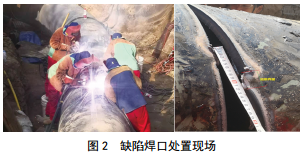 隨后立即按照應急處置預案啟動(dòng)應急程序,放空該段管道,疏散潛在影響半徑范圍內的人員,對缺陷處焊口進(jìn)行切割換管作業(yè)(圖 2)。焊縫搶險作業(yè)從發(fā)現問(wèn)題到搶修完成共計50小時(shí)45分鐘;切割舊管到新管段焊接完成共計23小時(shí)09分鐘。通過(guò)處置,及時(shí)消除了本段高后果區管道重大隱患。