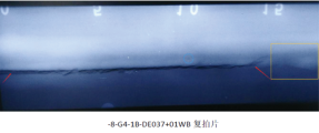 (1)復拍片出現裂紋的位置(兩個(gè)紅色箭頭中間的位置)在原片中未發(fā)現缺陷。