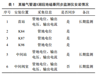 為了監測X湖段管地電位的變化,在某輸氣管道首站、中間站等位置安裝了地磁暴同步監測儀,可以同步監測管地電位、管中電流、恒電位儀輸出電壓(電流)等參數,采用GPRS網(wǎng)絡(luò )傳輸數據。該設備安裝在陰極保護間恒電位儀后面,不干擾陰極保護間其他通訊,安裝方便快捷,免維護,如圖 1所示。