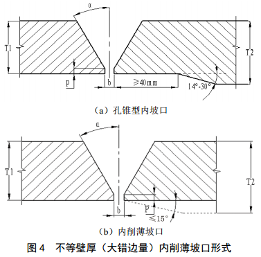 不等壁厚(大錯邊量)對接焊口的焊接,應采用內削薄的坡口形式以保證根焊焊縫的成型,提高焊口的一次合格率。目前厚壁側鋼管的削薄方式有兩種,分別如圖 4(a)和圖 4(b)所示。其中,孔錐型內坡口的主要問(wèn)題有三方面,首先是管件廠(chǎng)和鋼管廠(chǎng)的坡口加工能力尚不能達到普遍滿(mǎn)足要求的程度,尤其是要求孔錐型坡口的圓孔長(cháng)度達到150 mm時(shí),能夠達到的廠(chǎng)家更少;其次是管道地區等級改變、鋼管切割后現場(chǎng)還不具備坡口加工能力;最后是孔錐型坡口的圓孔與錐孔間的變角度拐點(diǎn)處應圓滑過(guò)渡,宜采用2.5°及以上的圓弧刀加工出過(guò)渡面,避免出現尖角狀的形狀突變。