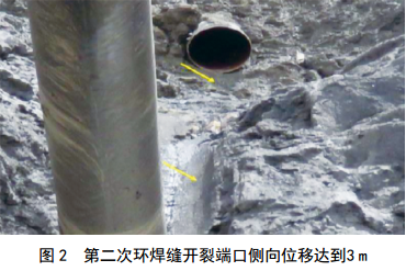 第二次事故發(fā)生于2018年1月(圖 2),再次開(kāi)展了現場(chǎng)修復和技術(shù)研究工作。包括:①委托位于新加坡的DNV GL公司開(kāi)展失效調查;②制定具有高應變能力的焊接工藝規程;③確定能夠達到焊接高應變能力焊縫的焊工資質(zhì)。