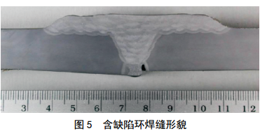 試驗二:采用具備高應變能力的焊接工藝規程。根焊采用E7016-H4,熱焊、填充和蓋帽都采用E9045-P2 H4R,手工電弧焊堿性實(shí)心焊條。環(huán)焊縫機械性能測試報告顯示,拉伸強度613~670 MPa,符合API標準(570~760 MPa)規定。焊縫、熱影響區和母材的沖擊功分別為160 J、 281 J和298 J。試驗結果顯示:失效發(fā)生在母材位置,失效時(shí)的拉伸應變大于3%(在根部預制了深2.9 mm、長(cháng)190 mm、寬0.7 mm的缺陷,并伴有2 mm錯邊)。見(jiàn)圖 4、圖 5。