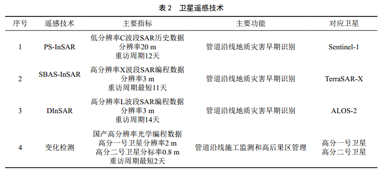 基于衛星遙感技術(shù)(表 2),在管道左右兩側0.1、0.5、2.5公里范圍開(kāi)展累計緩慢形變監測,實(shí)現管道沿線(xiàn)地質(zhì)災害早期識別,同時(shí)對管道周邊大范圍地質(zhì)變化情況進(jìn)行管控。采用國產(chǎn)高分辨率光學(xué)衛星對管道沿線(xiàn)進(jìn)行地物變化檢測統計及建筑物識別提取,查找人為因素導致的建筑用地變化區域,并做出相關(guān)分析,實(shí)現管道沿線(xiàn)施工監測和高后果區管理。