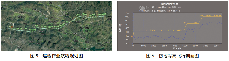 管道線(xiàn)路蜿蜒分布,根據實(shí)地勘察預先規劃無(wú)人機飛行航線(xiàn),采用曲線(xiàn)航點(diǎn)執行飛行任務(wù),航線(xiàn)規劃如圖 5所示。由于巡檢地區海拔高度在1350~1600 m范圍內變化,不同航點(diǎn)之間存在海拔高度差,如圖 6 的藍色地形高度曲線(xiàn)所示。規劃航線(xiàn)時(shí)航點(diǎn)高度選用絕對海拔高度,管道海拔低則規劃航點(diǎn)高度也低,海拔高則航點(diǎn)高度也高,如圖 6所示黃色航線(xiàn)高度,實(shí)現仿地等高飛行。