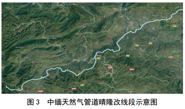 中緬天然氣管道貴州晴隆管段,如圖 3藍色段曲線(xiàn)所示,全長(cháng)約80 km,穿越高陡沖溝27處,其中大型高陡邊坡4處;穿越公路34次,其中等級公路3次;大開(kāi)挖穿越小型河流2處(北盤(pán)江、新寨河及支流)。全段位于山區,地質(zhì)條件復雜,地形多為沖溝、陡坡,起伏大,約10 km管段穿越西泌河二級水源地,管道沿線(xiàn)海拔在605~1760 m之間,相對高差超過(guò)1100 m。