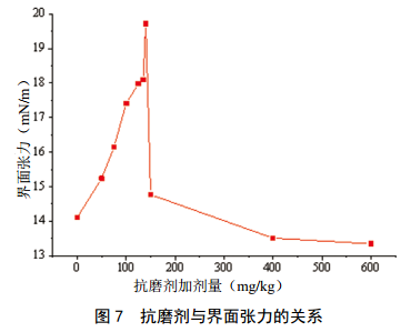 為了定量分析抗磨劑對柴油乳化成因,開(kāi)展了相關(guān)研究。從圖 7可以看出,投產(chǎn)所用柴油的界面張力隨著(zhù)抗磨劑加入量的增加,先升高后降低,界面張力最大點(diǎn)處正是實(shí)際管輸柴油中抗磨劑加入量處。