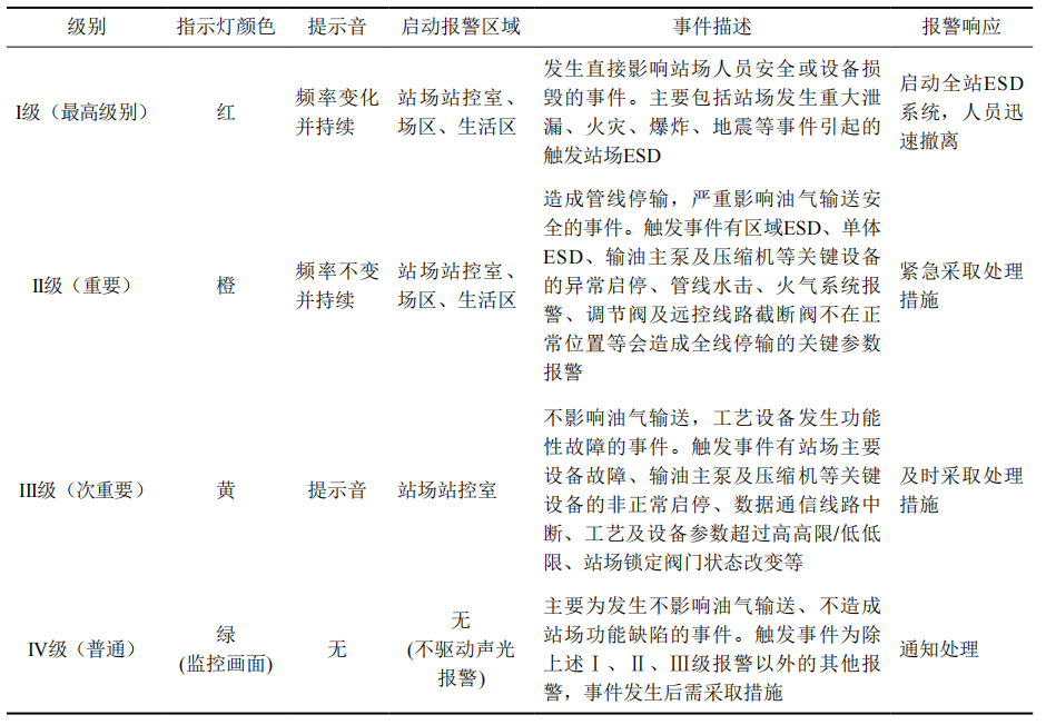 集中監視實(shí)施后,站場(chǎng)不再保留專(zhuān)職運行調度人員,僅設置24小時(shí)應急值班人員且無(wú)需固定在值班室,可以開(kāi)展其他巡檢、維檢修等工作。為此,站場(chǎng)新增報警RTU 、聲光報警器等設備,按事件等級設置不同報警聲音和燈光顏色,以保證站場(chǎng)發(fā)生異常事件分級報警并及時(shí)提醒現場(chǎng)應急值班人員處置。