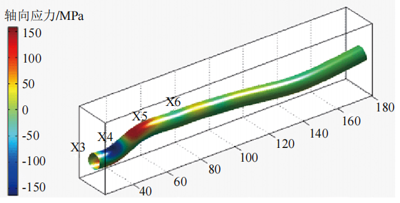 分析表明,X3、X4、X5截面管道應力集中明顯,X4截面應力最大且拉應力位于管底,X3、X5截面拉應力均位于管頂,X3—X5截面間管道出現彎曲變形。X5—X6 共12 m管段位于林間砂石路正下方,判斷該處形成約束點(diǎn),是造成X4 截面附近管道彎曲變形的主要原因,管道彎曲模型見(jiàn)圖 4。