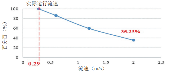 分別以流速0.29 m/s(管線(xiàn)實(shí)際流速)、0.60 m/s、1.20 m/s和2.00 m/s進(jìn)行計算。隨著(zhù)流速加快,介質(zhì)的攜水能力增強,預測得到的易產(chǎn)生積水的位置隨之減少。當流速增大到2.00 m/s時(shí),管內可能產(chǎn)生積水的位置明顯減少,數量約為實(shí)際運行流速的35.23%(圖 5)。管線(xiàn)運營(yíng)單位可根據實(shí)際情況,適當提高管內介質(zhì)流速,從而減少管內積水。