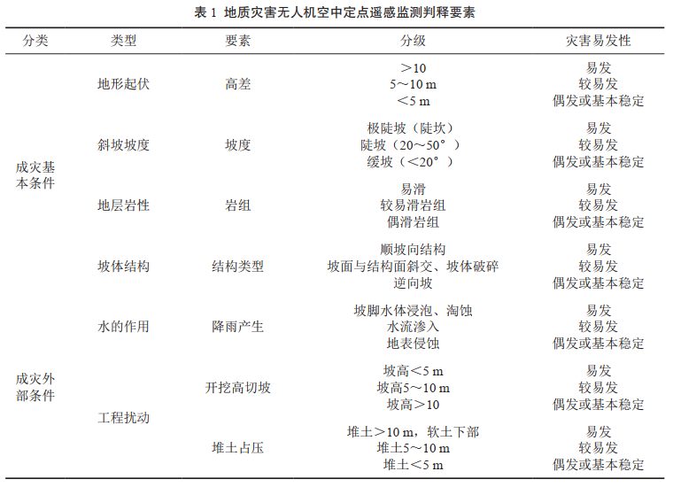 利用多旋翼無(wú)人機進(jìn)行空中定點(diǎn)遙感監測,并對無(wú)人機遙感影像資料進(jìn)行處理,查明管道周邊地質(zhì)環(huán)境是否具備地質(zhì)災害的成災條件,確認工程擾動(dòng)的范圍和強度,是否誘發(fā)地質(zhì)災害。在此基礎上,確定隱患問(wèn)題的類(lèi)型和發(fā)生條件及對管道的影響和危害程度(表 1)。