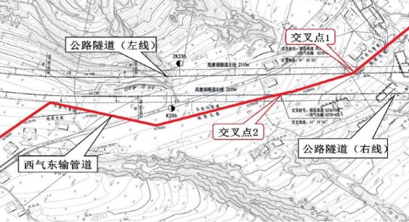 圖 1 公路隧道與管道相對位置平面圖