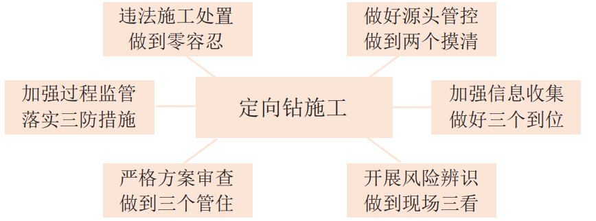 定向鉆施工因快捷、不擾動(dòng)地面等優(yōu)點(diǎn),在高后果區新建、改擴建地下管線(xiàn)施工中多優(yōu)先采用。由于現場(chǎng)施工人員風(fēng)險辨識能力不足、政府部門(mén)監管制度不完善和管道企業(yè)對定向鉆施工危害防控措施不到位等問(wèn)題,加上受到眾多建構筑物遮擋和司鉆點(diǎn)距離管道較遠的影響,導致施工信息收集困難,施工活動(dòng)不易被發(fā)現。國內近年來(lái)曾多次發(fā)生因定向鉆施工鉆破管道的事故,為防范類(lèi)似事故反復發(fā)生,要從六個(gè)方面加強管控。管道高后果區第三方定向鉆施工管控六個(gè)關(guān)鍵環(huán)節如圖 1所示。