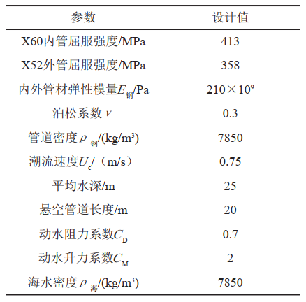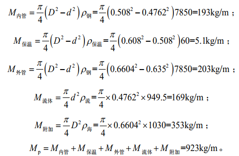 海底懸空管段的單位長(cháng)度質(zhì)量包括輸送流體質(zhì)量、內管質(zhì)量、保溫層質(zhì)量、外管質(zhì)量、附加質(zhì)量(一般可取管道排開(kāi)水體積的1~2倍)。分別計算M流體、M內管、M保溫、M外管、M附加,相加得出海底管道的單位長(cháng)度質(zhì)量MP。