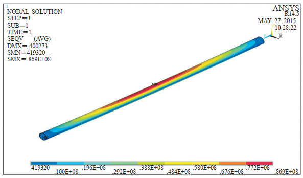 簡(jiǎn)單支撐懸空管段最大應力出現在管道的中間節點(diǎn),最大值為86.9 MPa,最小應力為0.4193 MPa,最大變形量為400 mm;如圖 5所示。