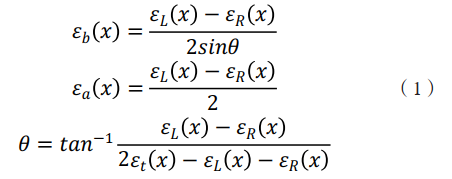 沿管道縱向布設的分布式光纖傳感器并不能直接得到管道的彎曲應變,測量結果是彎曲應變和軸向應變疊加的結果,并且由于施工以及管道空間變形等原因,傳感器與管道中心平面之間也可能存在一定角度。針對上述問(wèn)題,筆者建立了根據分布式光纖應變監測數據提取管道彎曲和軸向應變的方法[7-11],具體計算公式如下:
