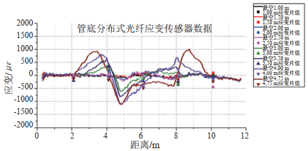 隨著(zhù)懸空長(cháng)度的增加,分布式應變數據的形狀都具有清晰的懸空特征,并且懸空段的峰值應變也明顯增加,工況8的試驗結果表明,所建立的懸空監測方法,不但可以準確識別管道懸空的發(fā)展,而且可以有效判斷管道的觸底行為。