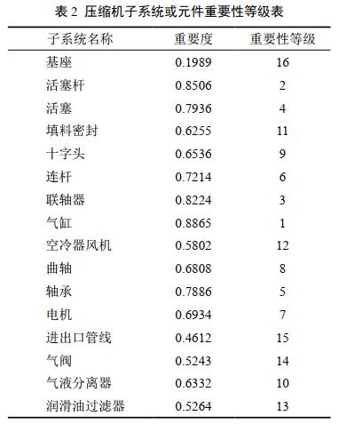 以某雙列雙級對置平衡式往復壓縮機為例,工作排量15.2 m3/h,二級出口壓力0.55 MPa,其典型故障包括氣閥、彈簧、活塞環(huán)故障,機組振動(dòng),活塞桿發(fā)熱、磨損、斷裂,氣缸磨損等故障模式。由表 2可以看出,對壓縮機部件進(jìn)行重要性評價(jià),重要性級別相對低的部件通常采用事后維修;重要性級別高的部件是維護重點(diǎn),需通過(guò)分析確定維修策略。該壓縮機17個(gè)元部件參與分析,約含47個(gè)故障模式,其中活塞桿、連桿、氣缸和軸承等是壓縮機系統中風(fēng)險等級相對較高的元部件?梢罁L(fēng)險等級的高低來(lái)確定響應的維修方式。