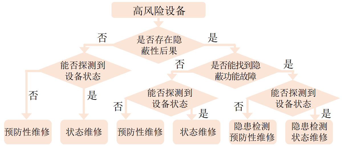 低風(fēng)險設備維修方式取決于預防措施投入是否較事后維修更經(jīng)濟、有效。中風(fēng)險設備應進(jìn)行合理的“成本-收益”分析以確定維修方式。高風(fēng)險設備通過(guò)調整設備維修方式或縮短停機時(shí)間來(lái)降低故障頻率,維修方式的決策樹(shù)如圖 4所示。