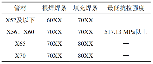 (4)焊條選型。阿美標準規定在役焊接一般采用低氫堿性焊條而不用纖維素焊條,不同鋼材等級管道應選擇的焊條最低抗拉強度[2]如表 2所示。