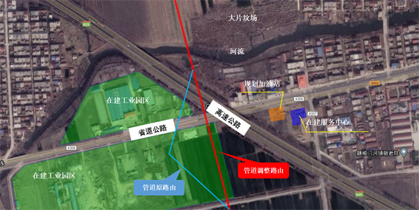 (1)中俄東線(xiàn)(永清—上海)江蘇段在施工設計及外協(xié)征地期間,地方相關(guān)部門(mén)提出管道所處某區域已經(jīng)規劃為工業(yè)園區招商引資,要求管道進(jìn)行避讓。同時(shí)管道路由東側擬規劃建設政府行政服務(wù)中心和加油站。經(jīng)過(guò)多次組織現場(chǎng)踏勘和特定場(chǎng)所復核,確;A數據資料準確無(wú)誤后,從確保本質(zhì)安全和公共安全出發(fā)調整了管道路由設計。如圖 2所示。