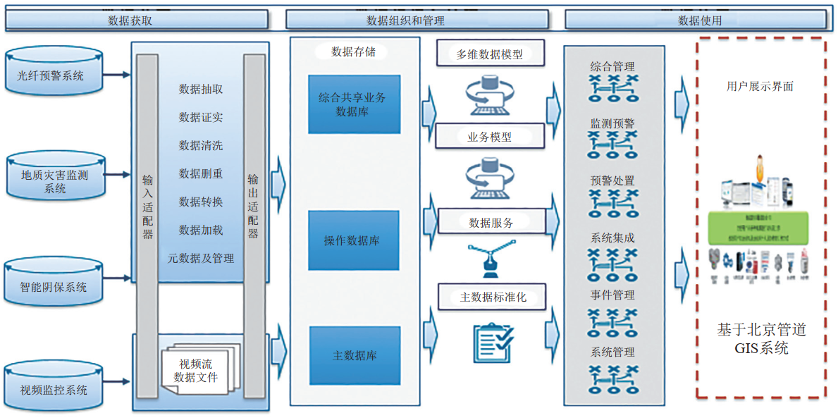 (2)自建系統數據單元融合。統一梳理光纖預警系統、地質(zhì)災害監測系統、智能陰保系統、交叉工程綜合管理系統、視頻監控系統等自建系統現有數據源,通過(guò)數據ETL、集成多元數據、優(yōu)化網(wǎng)絡(luò )環(huán)境等手段,打通各系統數據孤島,形成完整數據湖,建立數據庫“多端錄入,從一互聯(lián)”機制,避免多個(gè)系統數據重復錄入工作,提升數據完整性。如圖 2所示。
