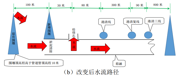 (1)連夜在來(lái)水方向修筑圍堰,疏通箱涵,使洪水改變路徑從箱涵的檢修孔出水進(jìn)入交叉施工作業(yè)坑內,防止作業(yè)坑周?chē)畨翁Ц咦鳂I(yè)坑內水的高程,降低洪水進(jìn)入作業(yè)坑的動(dòng)能。如圖 1所示。