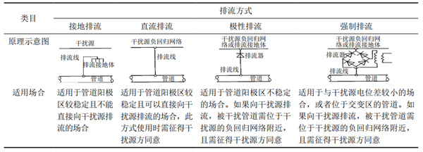根據管道直流雜散電流調查和測試結果,選擇排流保護、陰極保護、防腐層修復、等電位連接、絕緣隔離、絕緣裝置跨接和屏蔽等干擾防護措施。對于已采用強制電流陰極保護的管道,應首先通過(guò)調整現有陰極保護系統抑制干擾。當調整被干擾管道的陰極保護系統不能有效抑制干擾的影響時(shí),應采取排流保護及其他防護措施。常用的排流保護措施如表 1所示。