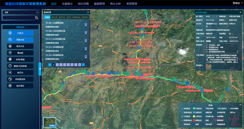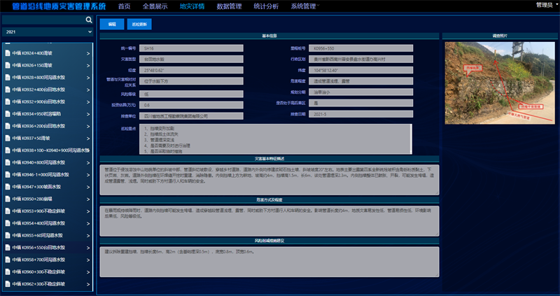 西南管道貴陽(yáng)輸油氣分公司在總結提煉管道地質(zhì)災害管理經(jīng)驗的基礎上,研發(fā)山區管道地質(zhì)災害管理信息系統,以在線(xiàn)遙感影像和服務(wù)為基礎,通過(guò)應用坐標算法轉換實(shí)現GIS空間數據(管道路由、站場(chǎng)閥室、風(fēng)險區及地質(zhì)災害點(diǎn)等)及常規數據的脫密可視化展示,并提供常規的地圖操作功能,能夠靈活瀏覽及更新地質(zhì)災害及防治相關(guān)數據。同時(shí),通過(guò)多方數據整合,實(shí)現智能統計分析,后期可結合管道數字孿生體建設,實(shí)現管道地質(zhì)災害防控的智能分析決策。